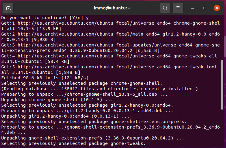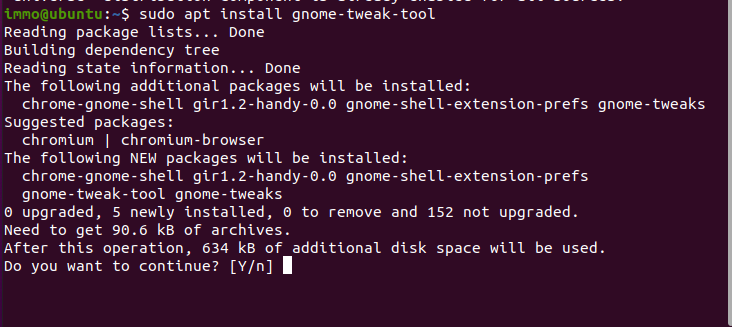 - Po zadání příkazu se spustí rozbalovací proces, při kterém se nám zobrazí nabídka, zda chceme pokračovat - bude nutné zadat "y" (bez úvozovek) jako yes pro pokračování, a poté se nám gnome tool nainstaluje.