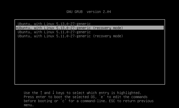 - Na další nabídce vybereme Ubuntu, with Linux 5.13.0-27-generic (recovery mode) - mělo by být jako druhé v nabídce