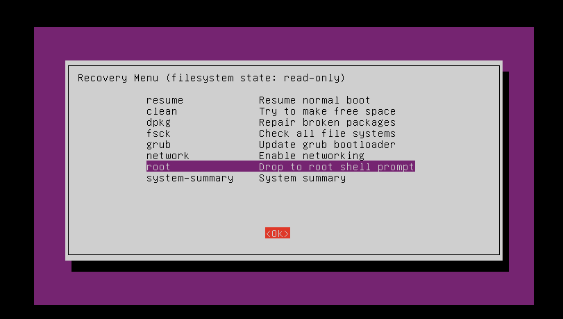 - Poté se nám objeví šedo-fialová nabídka, kde budou různé akce jako resume, clean aj. -> Pro nás je důležité akce ROOT - Drop to root shell prompt ... Tu vybereme a stiskneme Enter