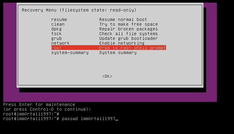 Obnovení hesla v režimu obnovení (recovery mode) resetujéme heslo libovolnému účtu