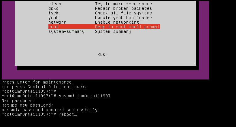 - Jak jsem psal výše, poté co nám konzole vypíše, že heslo bylo úspěšně změněno, napíšeme příkaz: reboot ... A systém se restartuje ! :-)