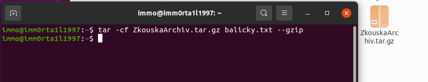 - Po otevření terminálu si zadáme příkaz: tar -cf ZkouskaArchiv.tar.gz balicky.txt --gzip